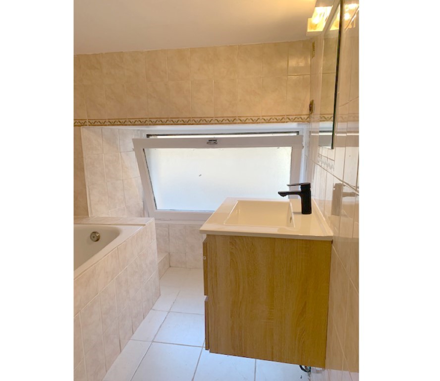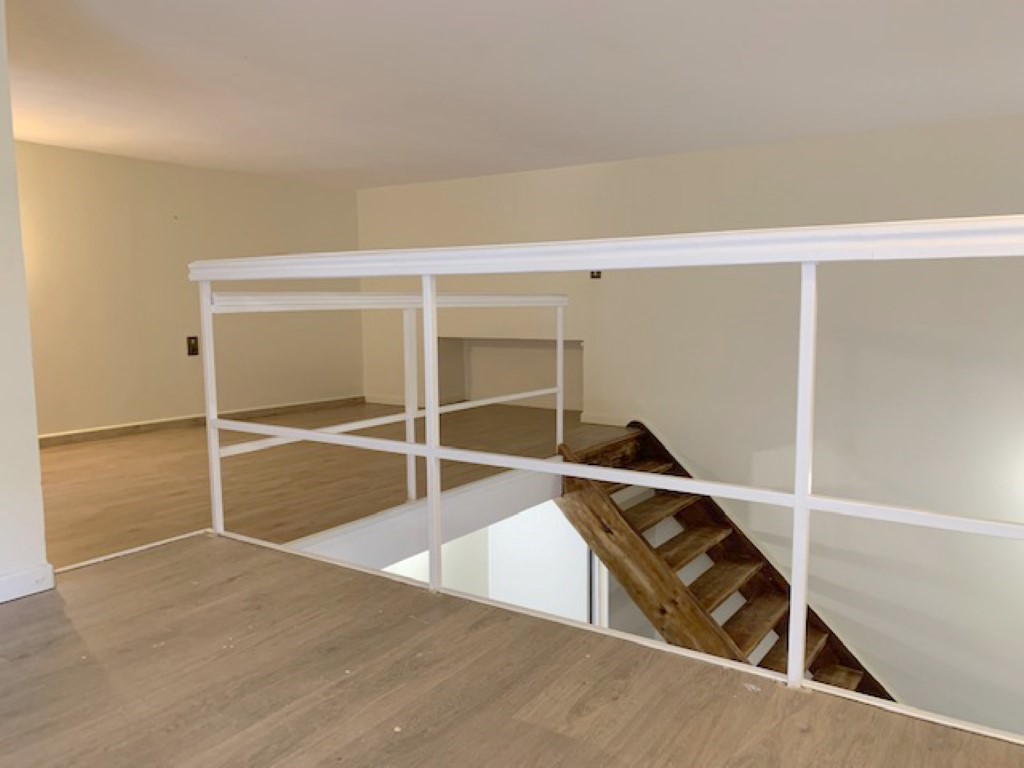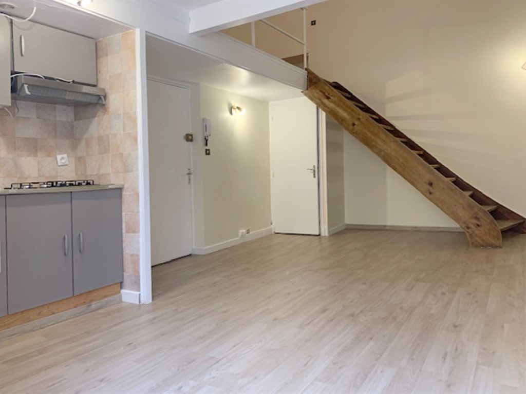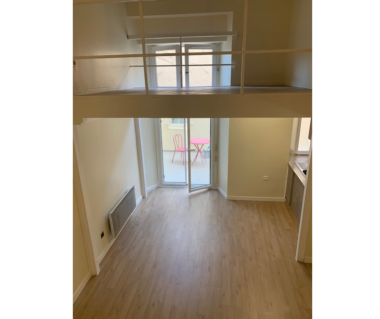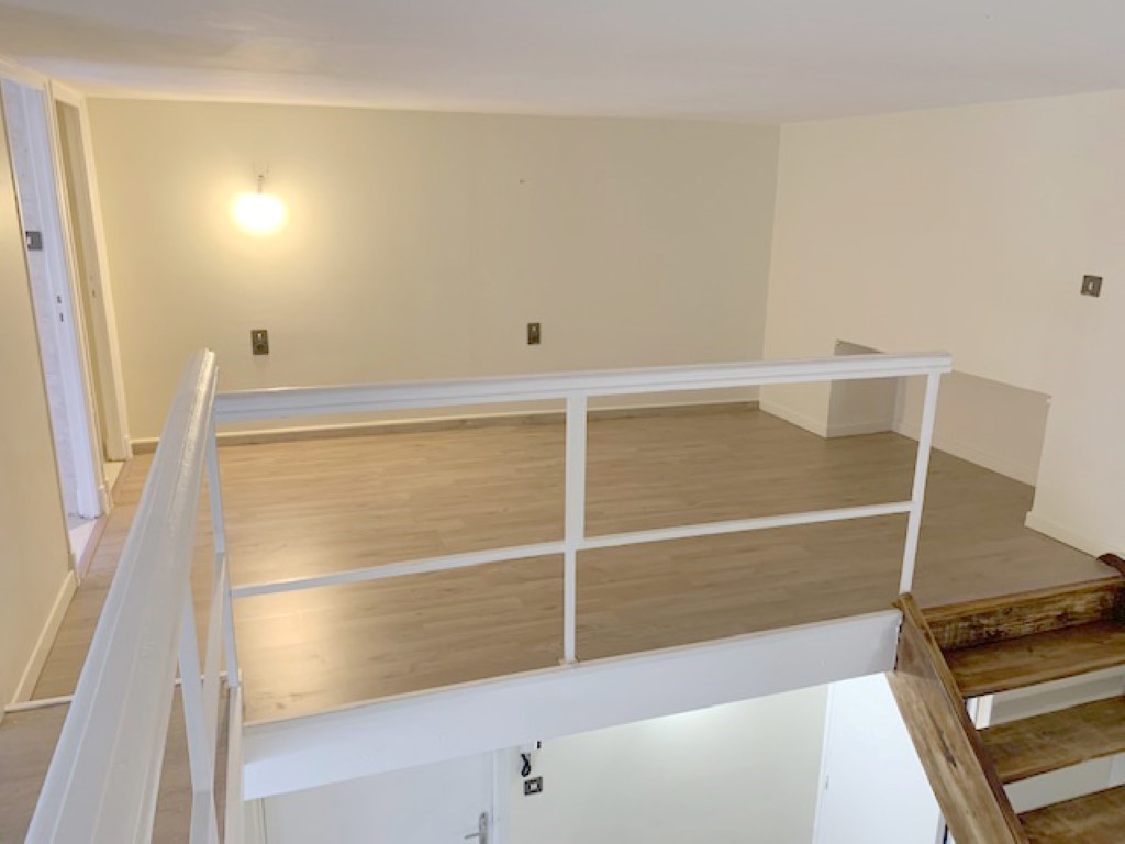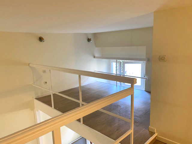 On pénètre dans un grand séjour/salon avec coin cuisine meublée et équipée (plaque de cuisson, hotte aspirante) qui donne sur une terrasse. Un grand espace nuit en mezzanine (< 1,80 m de hauteur), une salle d’eau et un WC séparé. Une cave commune pour les vélos est également incluse.